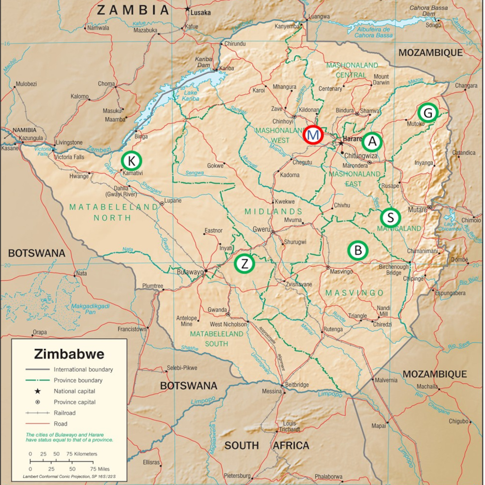 A: Arcadia Mine near Arcturus and Goromonzi; S: Sabi Star Mine between Buhera and Mutare; B: Bikita Mine southeast of Mashingo; Z: Zulu Mine near Fort Rixon; K: Kamativi Mine near Kamativi; G: Good Days Mine east of Mutoko; M: M(a)pinga Energy Park in Mashonland West.